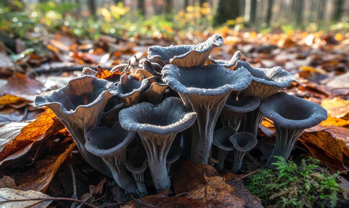La trompette de la mort, noire et discrète, pousse dans les litières de hêtres en octobre-novembre. Son goût profond et fumé en fait un excellent ingrédient pour les sauces et les plats mijotés, surtout séchée.