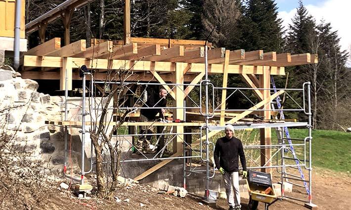 Les travaux sont bien avancés … une extension toujours tout en bois, avec la même vue magnifique sur le petit village de Liézey et sur les montagnes vosgiennes.